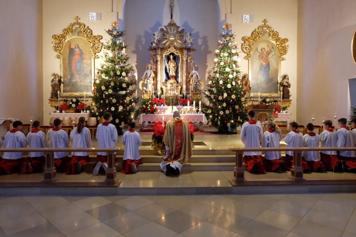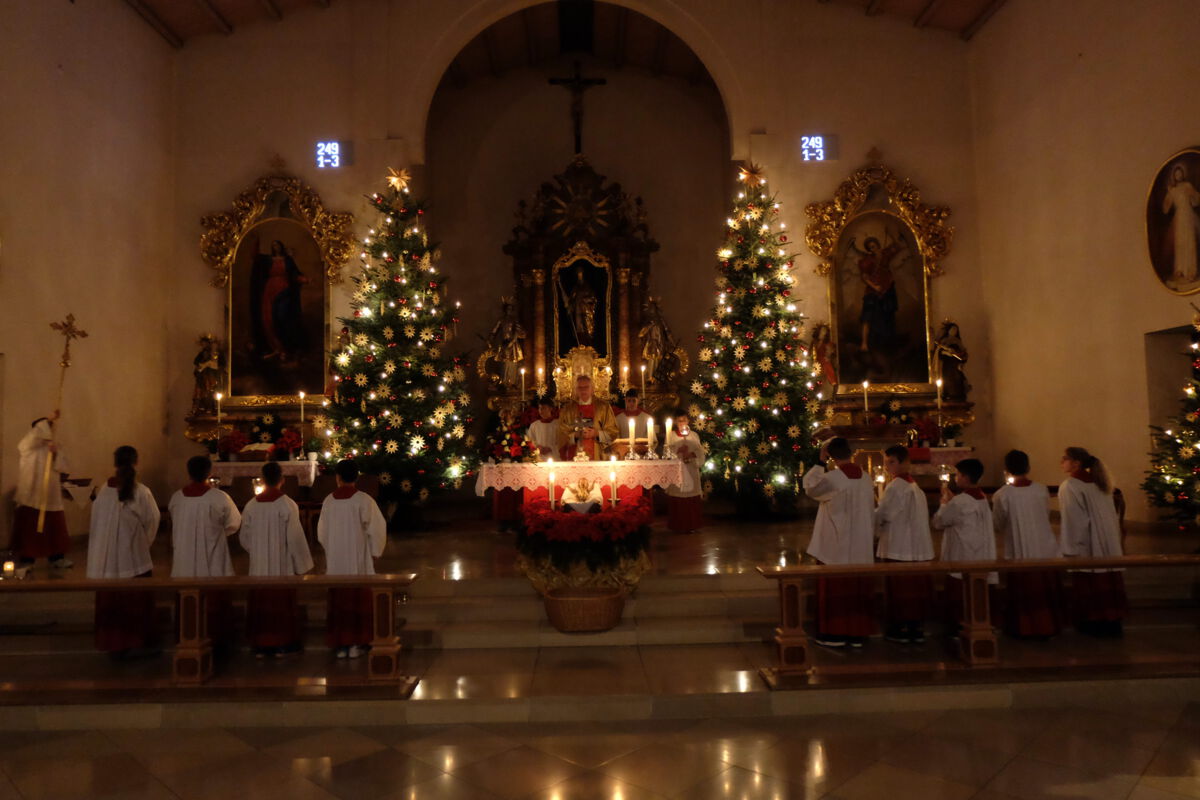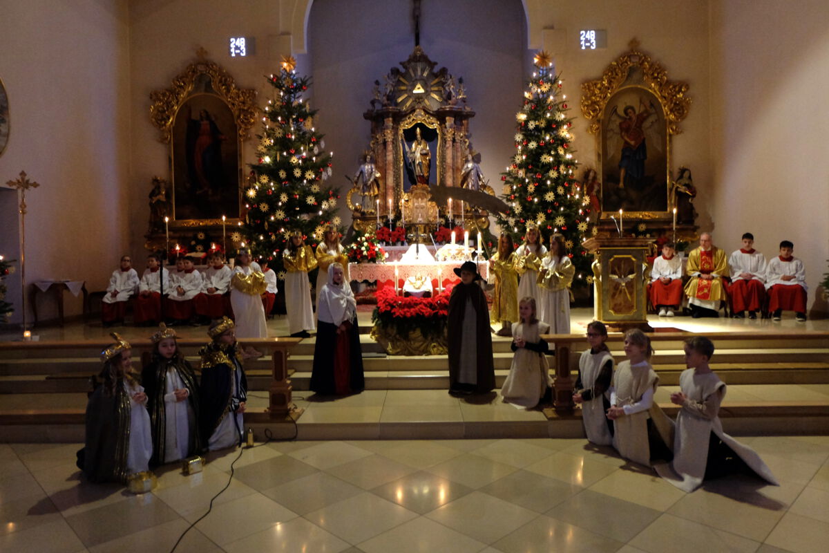 Mit der Kinderchristmette am Nachmittag des Heiligabends wurde der Festreigen eröffnet. Schülerinnen und Schüler der dritten und vierten Grundschulklasse stellten dabei die Ereignisse rund um die Geburt des Jesukindes in einem Krippenspiel bildlich dar. Dabei zogen die reichen Sterndeuter zusammen mit den armen Hirten gemeinsam zum Stall. Dort wurden sie von Josef und Maria mit den Worten begrüßt: „Ob klein oder groß: Kommt alle her zum göttlichen Kind und betet es an, damit ihr Frieden findet in dieser Welt.“ Zur Kinderchristmette wurden traditionelle Weihnachtslieder gesungen, die von Karin Regensburger an der Orgel instrumental begleitet wurden.